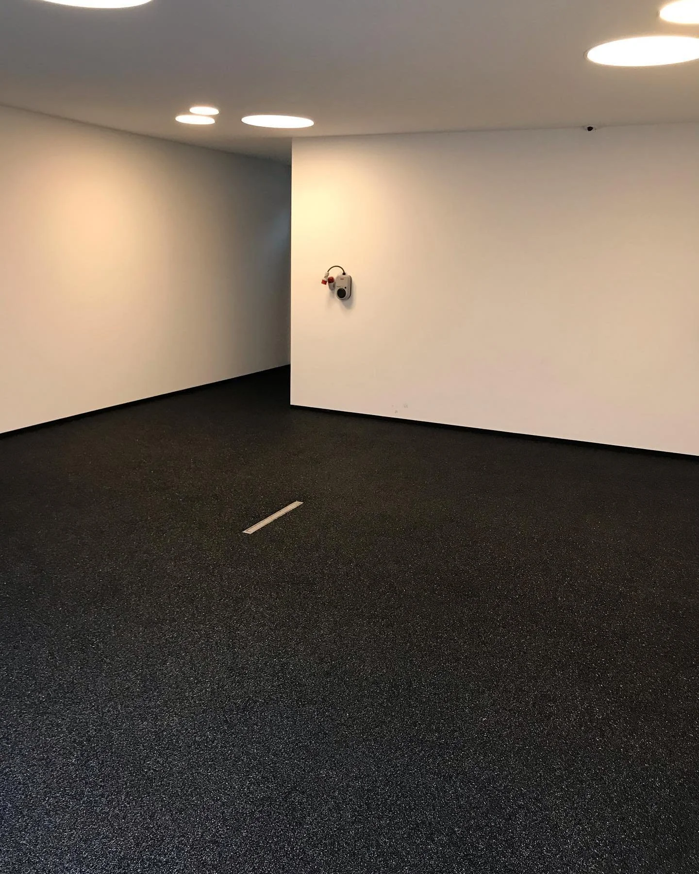 Kunstgalleri med hvide vægge og flere moderne kunstværker udstillet, et atomskeptretøj er synligt i baggrunden. Med flot fugefri gulv, Microcement, PU, og garagegulv.
