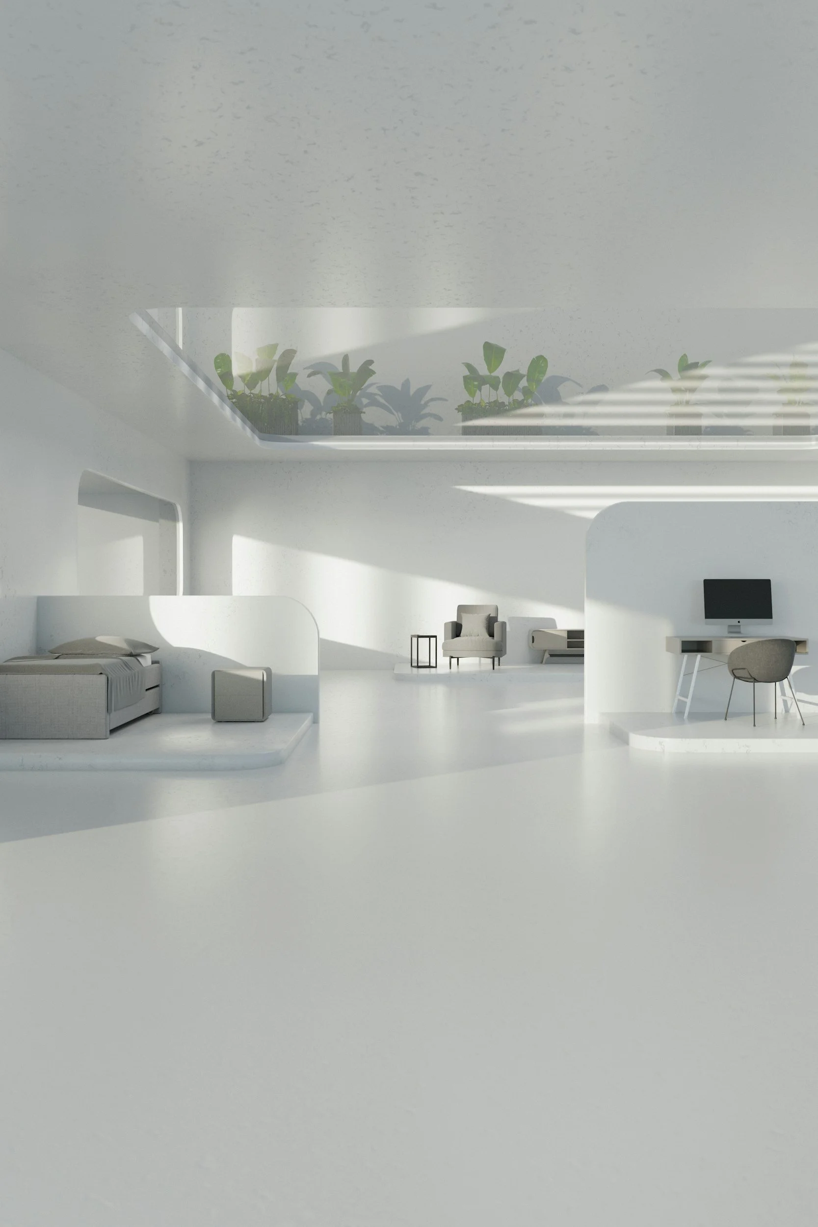 Moderne, minimalistisk stue med lyse farver, grønne planter på ovenlys, enkelt møblement inklusive seng, lænestol, skrivebord med computer og små borde. Med flot fugefri gulv, Microcement, PU, og garagegulv.
